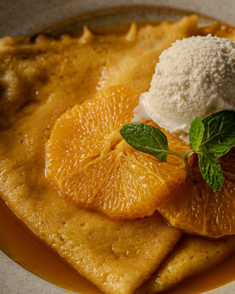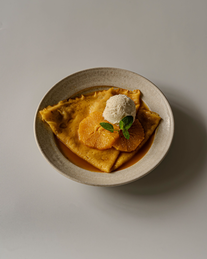Peaceの豆乳を使ったクレープ生地に埼玉県寄居町の風布みかんとオレンジジュース、カラメルを一緒に煮込み、仕上げには自家製ジャージーミルクアイスを添えた一皿。