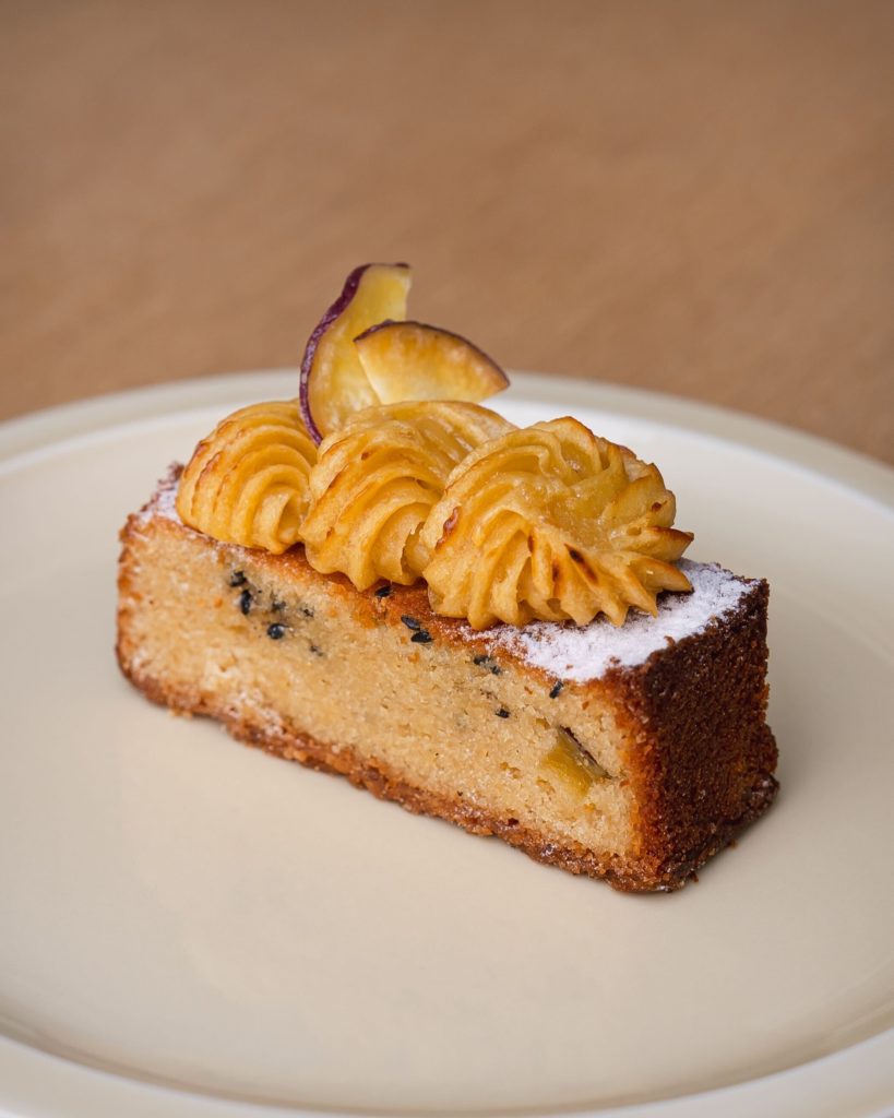 胡麻を練り込んだ香ばしいタルト生地に、しっとりした甘味のある紅はるかの焼き芋ダマンド。
