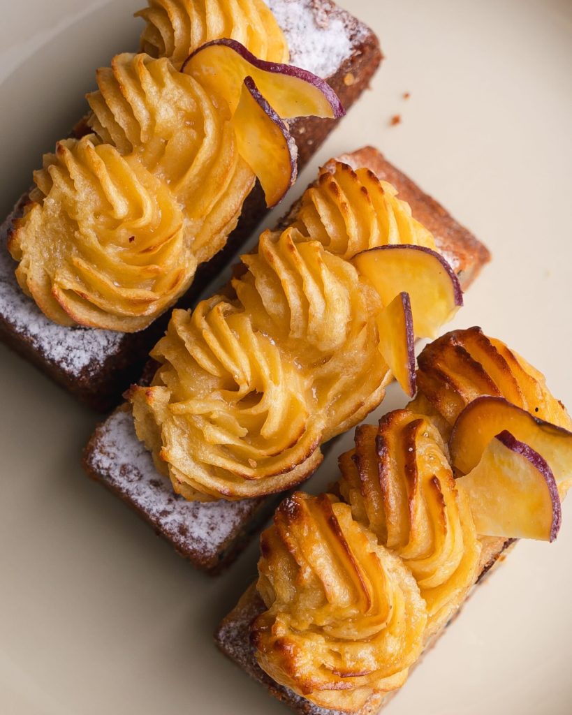 上にはなめらかなスイートポテトと、カリッと軽やかなさつまいもチップスをトッピング