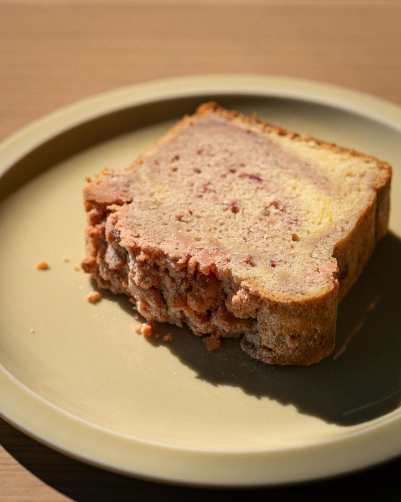 苺とラズベリーの果肉を生地に混ぜ込んだ、ほんのりピンクのマーブルパウンド。トップのクランブルにも苺を加えて、甘酸っぱさの中に香ばしさもプラスしました。